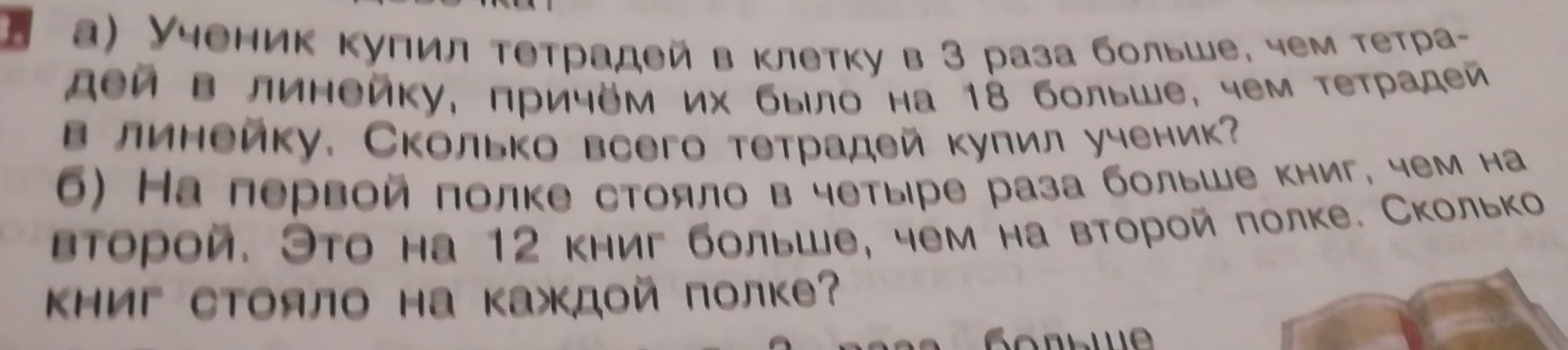 Ученик купил тетрадей в клетку в 3 раза больше чем тетрадей в линейку причем их было на 18 больше чем в линейку Сколько всего тетрадей купил ученик