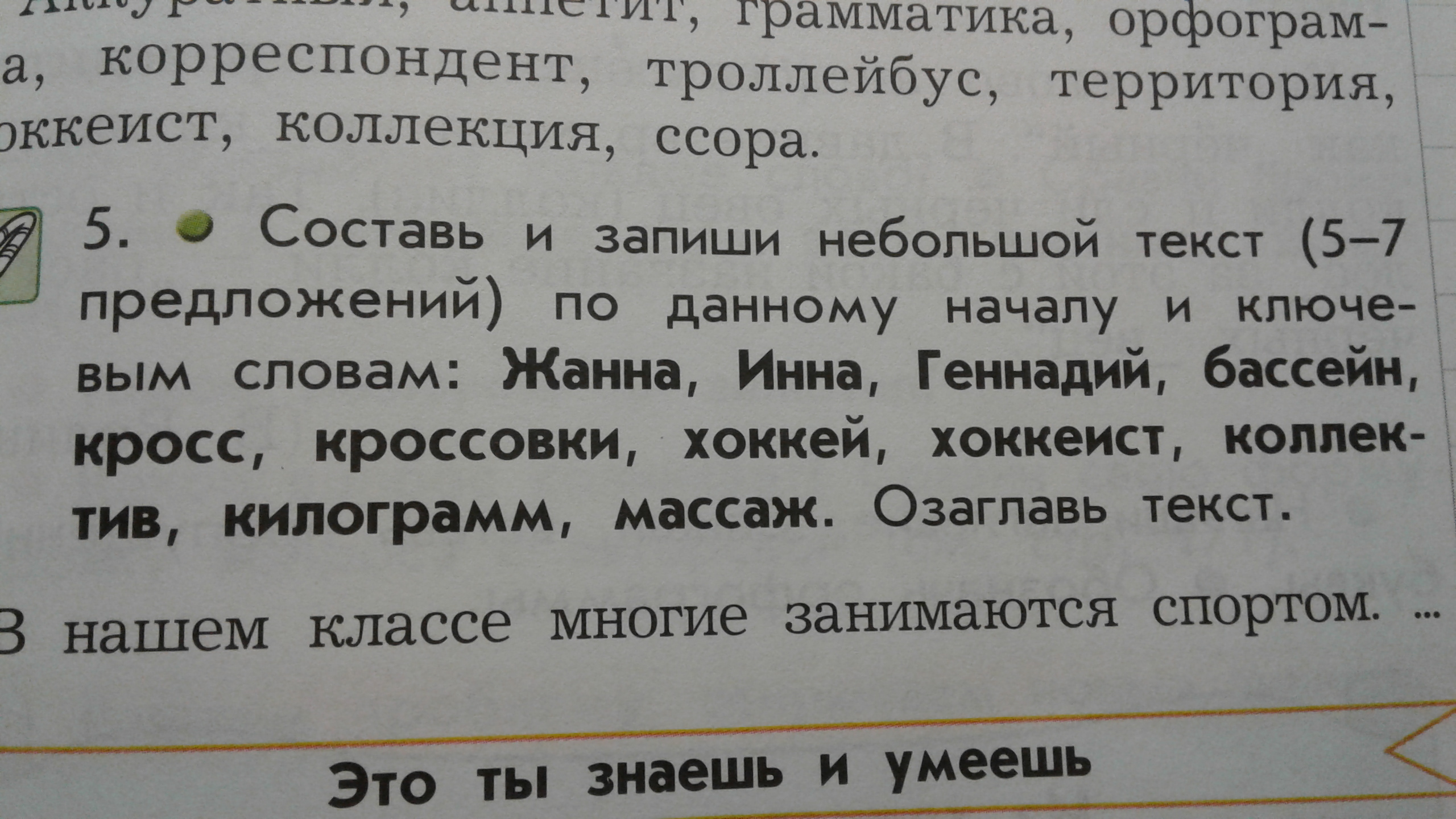 В нашем классе многие занимаются спортом. Геннадий - хоккеист он играет в хоккей. Инна прыгает в бассейн. Жанна одевает кроссовки и бегает кросс. Наш класс очень дружный коллектив!!!