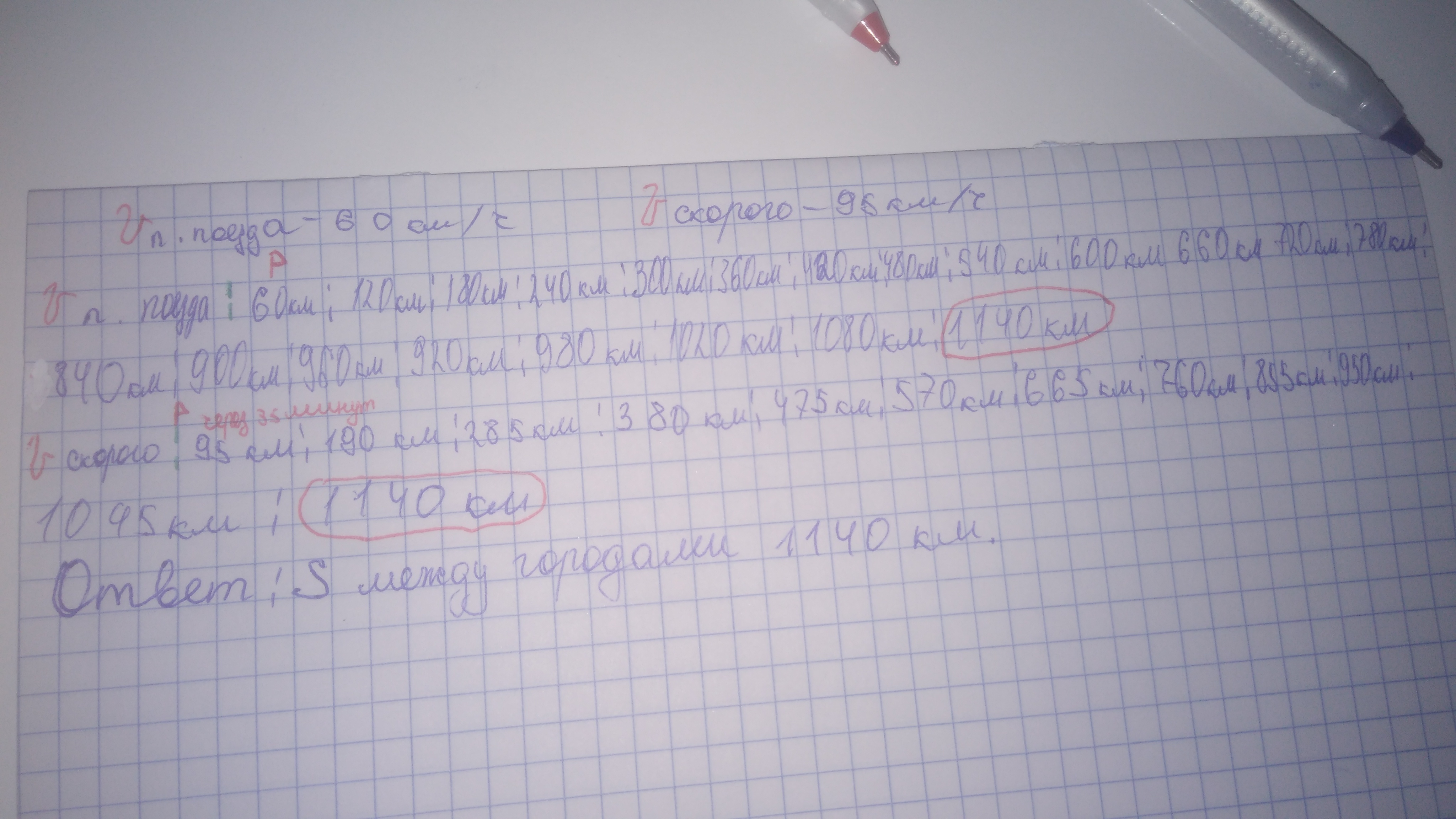 Из двух городов на встречу друг другу выехали два поезда, причём скорый поезд выехал через 35 минут после пассажирского. Какое расстояние между городами, если скорость пассажирского поезда равна 60 км/ч, а скорость скорого - 95 км/ч. (Скорый и Пассажирский прошли одинаковое расстояние)