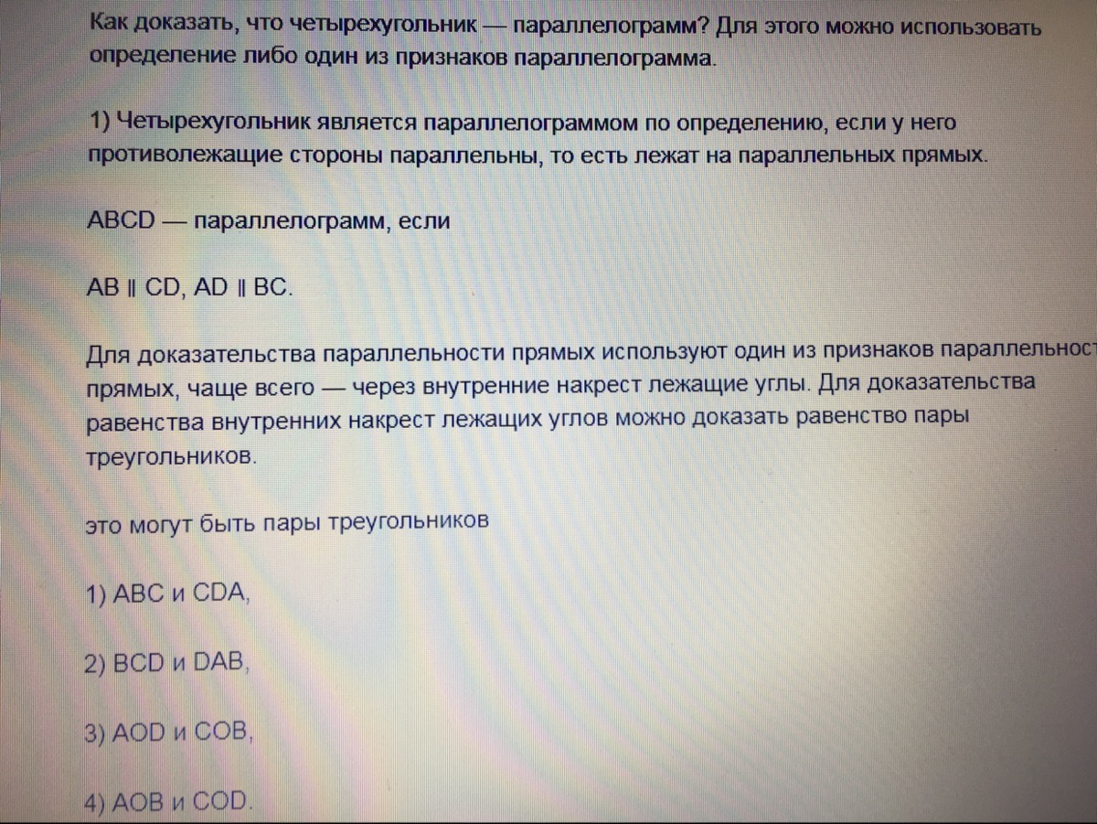 В параллелограмме ABCD это признак выглядит так: AB=CD и AB||CD. Нарисуйте диагональ АС. Полученные треугольники окажутся равными по второму признаку. АС - общая сторона, углы ВАС и АСD, также как и ВСА и CAD, равны как лежащие накрест при параллельных прямых AB и CD (дано в условии). Но так как эти накрест лежащие углы относятся и к сторонам AD и BC, значит эти отрезки также лежат на параллельных прямых, что и подвергалось доказательству.