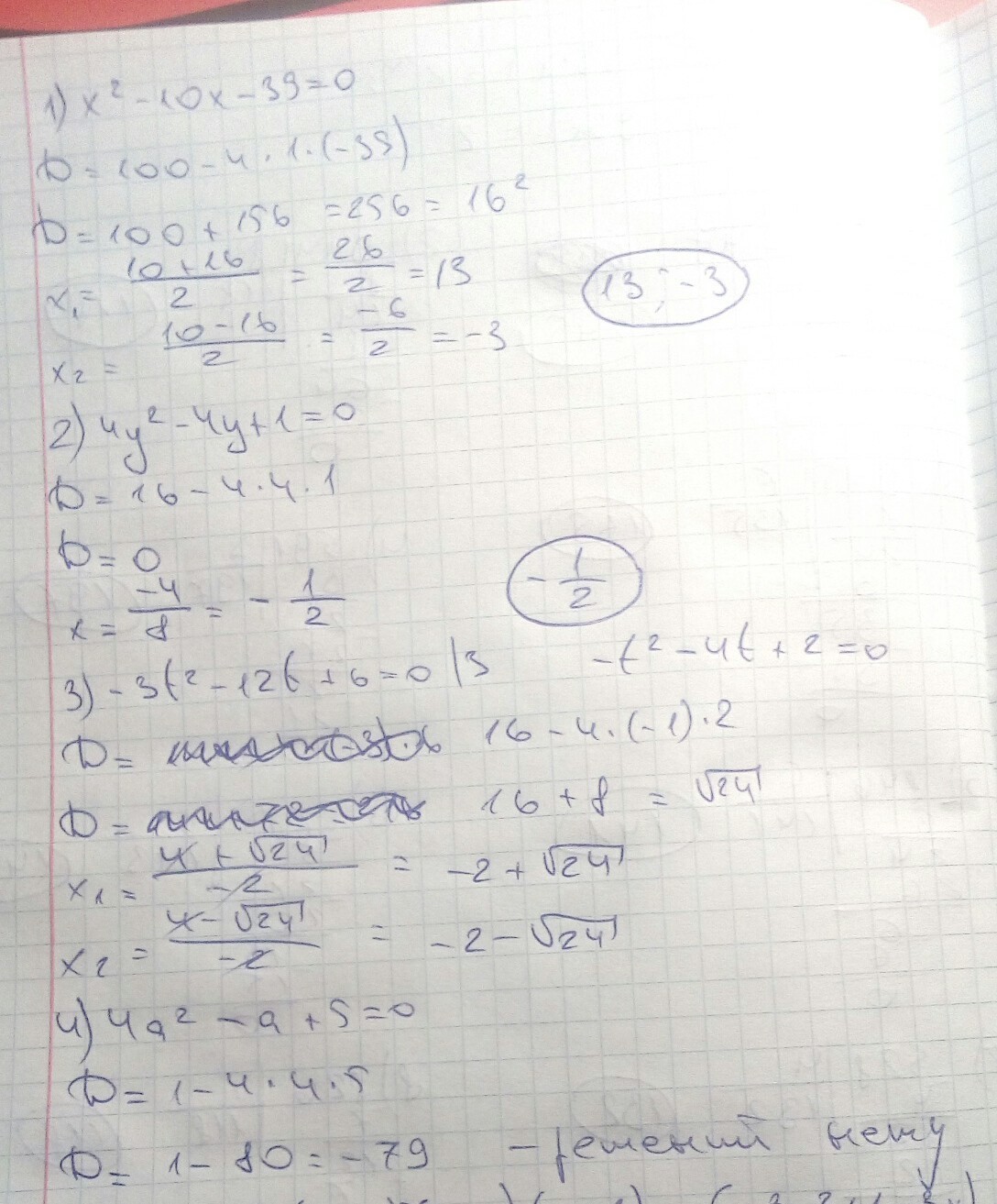 4у2-4у+1=0; Д=16-16. Д=0. При Д= 0,у нас один корень,который можно вычислить по формуле в/2а. -4/8. х=-0.5