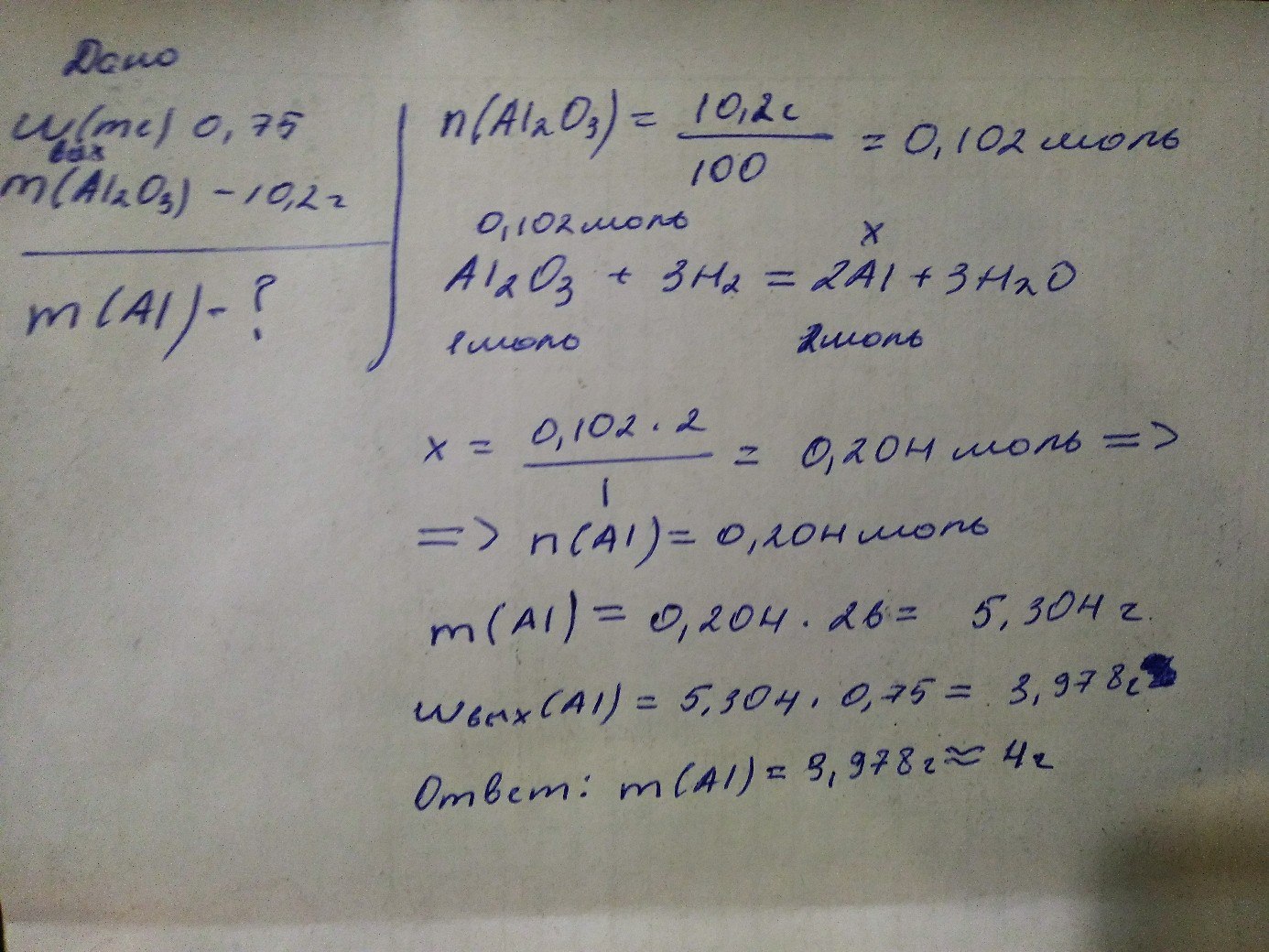 какая масса алюминия получится при восстановлении 10,2 оксида алюминия водородом, если массовая доля выхода маталла 0,75?