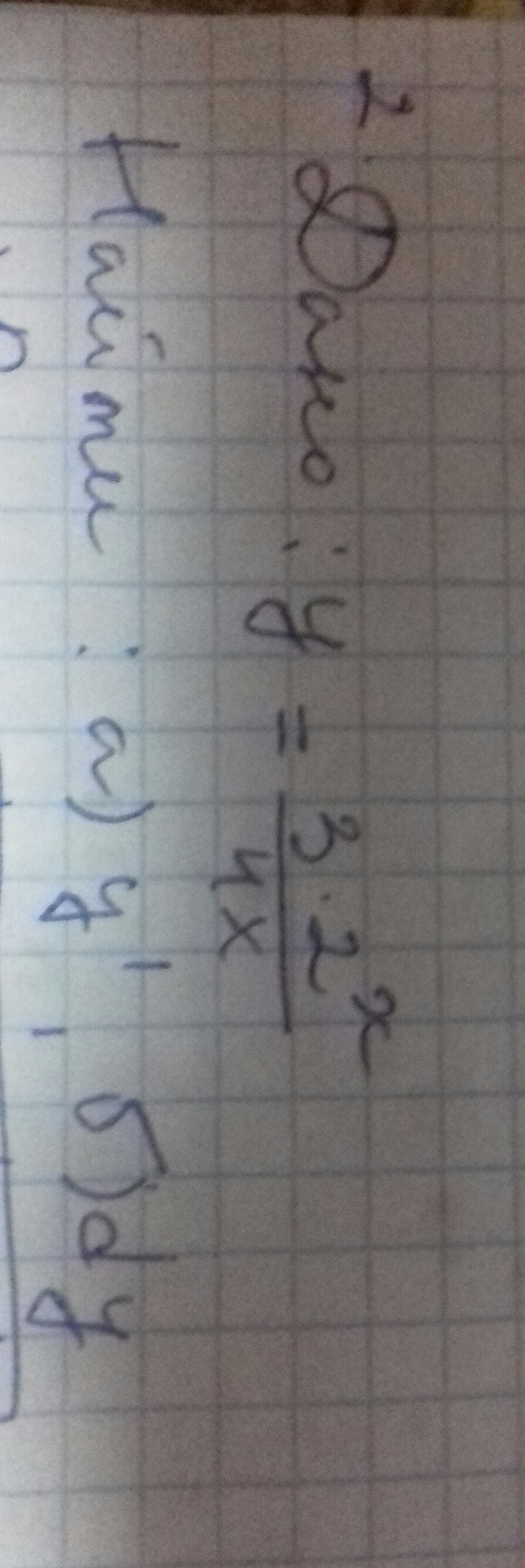 y= frac{3cdot 2^{x}}{4x}\\y'=Big (frac{3}{4} cdot frac{2^{x}}{x}Big )'=  frac{3}{4}cdot frac{2^{x}cdot ln2cdot x-2^{x}cdot 1}{x^2} = frac{3}{4}cdot frac{2^{x}cdot (xcdot ln2-1)}{x^2} \\dy= frac{3cdot 2^{x}cdot (x cdot ln2-1)}{4x^2} cdot dx