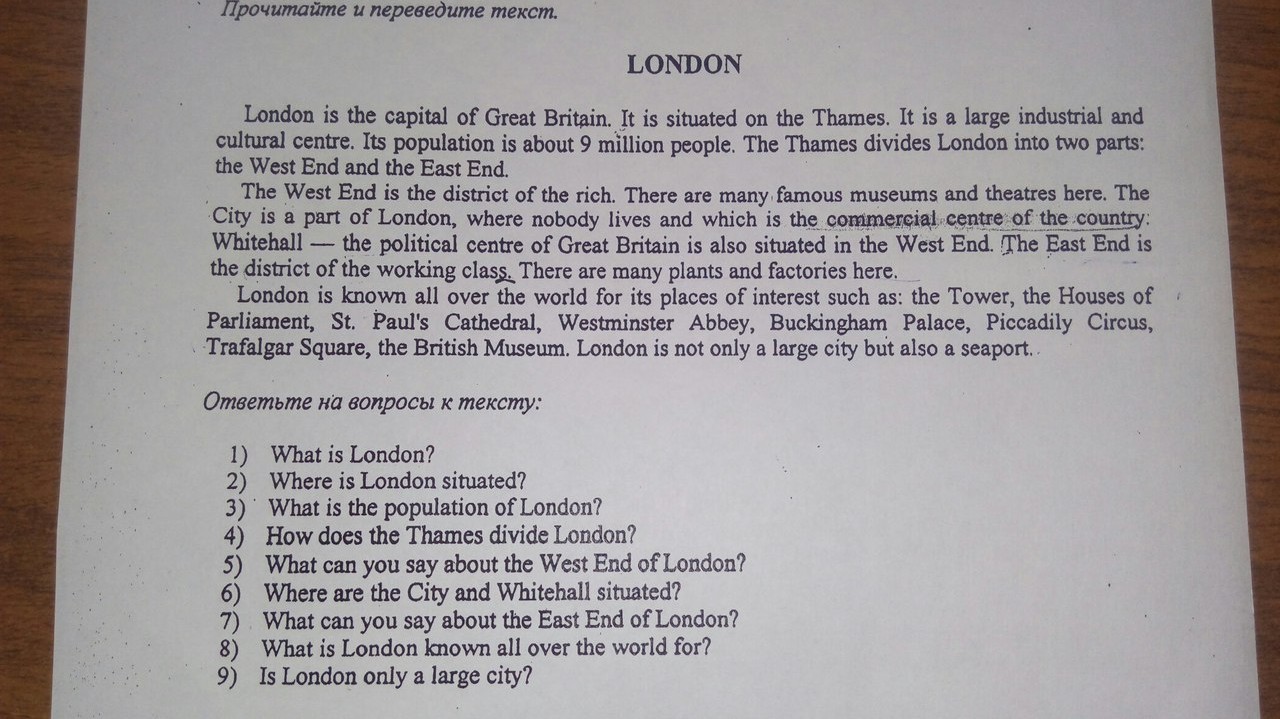 Лондон это столица Великобритании. Он расположен на Темзах. Это огромный индустриальный и культурный центр. Популяция составляет около 9млн. чел. Темза делит Лондон на две части: Вест-Энл и Ист-Энд (названия не переводят)