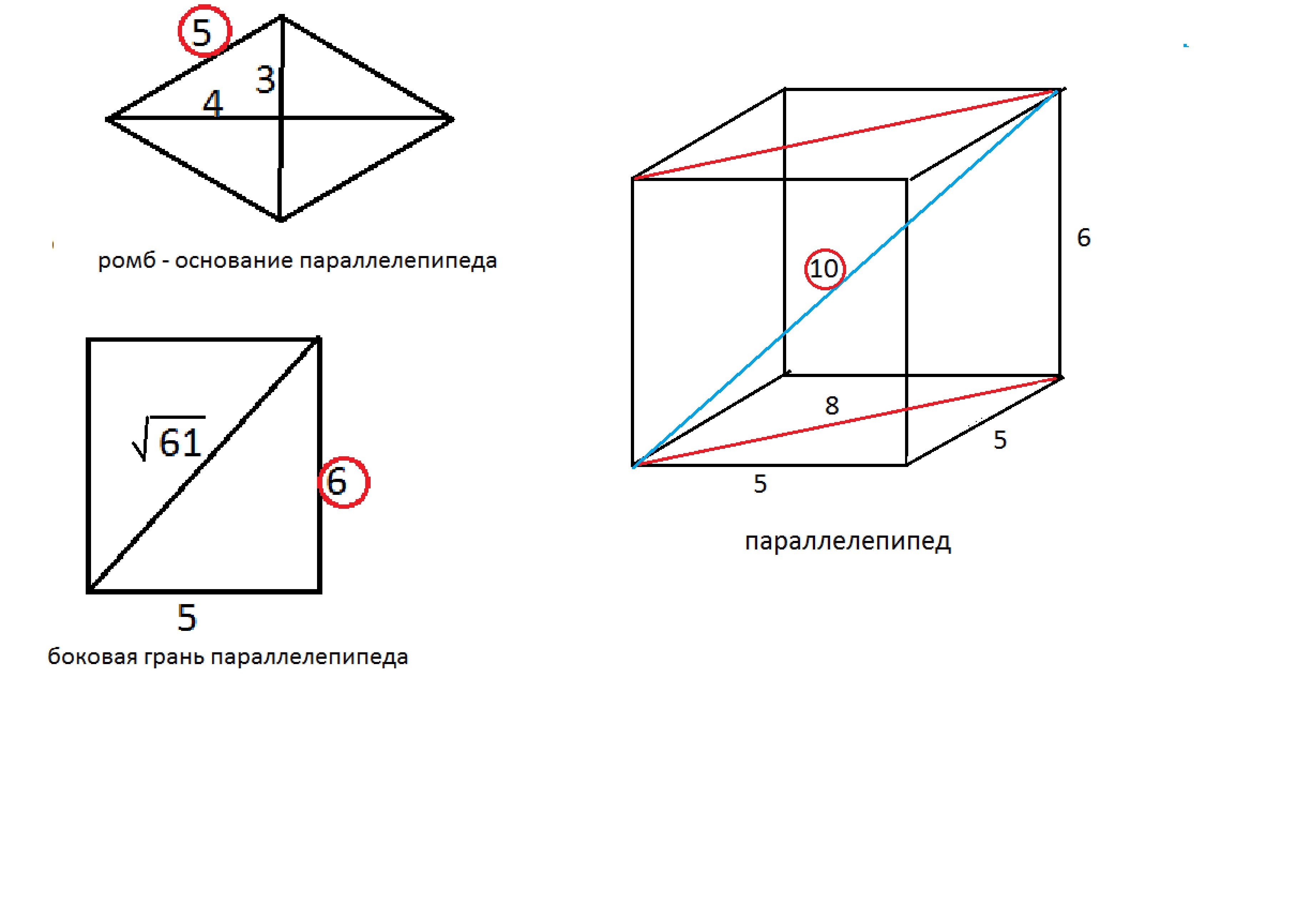 Основанием прямого параллелепипеда служит ромб с диагоналями 6см и 8см. Диагональ боковой грани равна (квадратный корень из 61 см). Найти большую диагональ параллелепипеда, площадь полной поверхности.