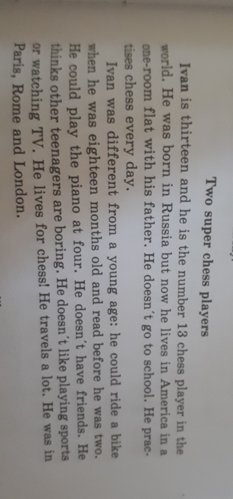 Ивану 13 лет и он занимает тринадцатое место в мировом рейтинге шахматистов. Он родился в России, но сейчас он живет в Америке в однокомнатной квартире со своим отцом. Он не ходит в школу. Он практикуется в игре в шахматы ежедневно.