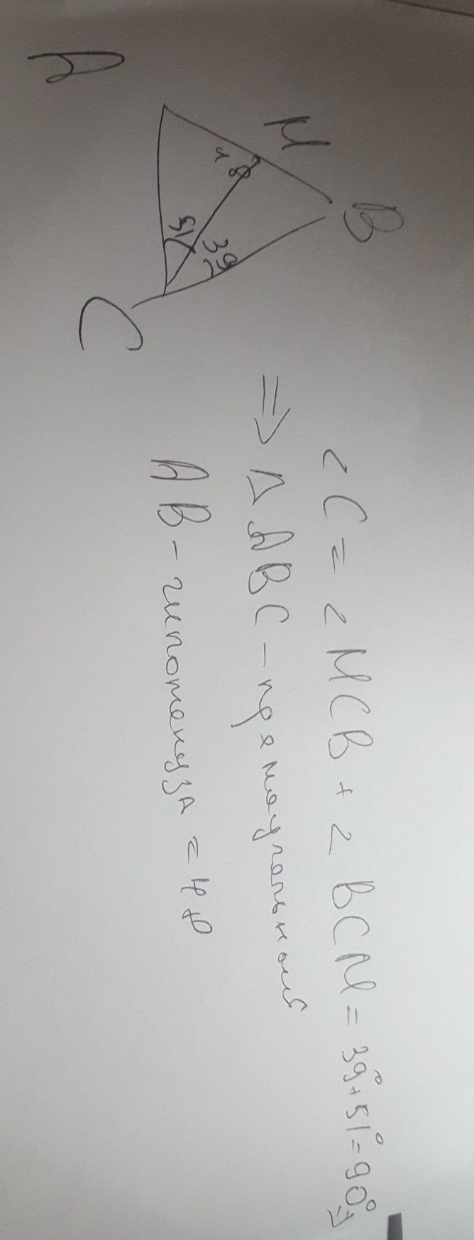 В треугольнике ABC известно что угол ACM = 51 градус, угол MCB = 39 градусов, M середина стороны AB AB = 48 найдите длину отрезка