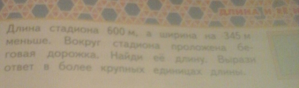 помогитеO_О номер 5 длина стадиона 600м,а ширинна 345м меньше. Вокруг стадиона проложена беговая дорожка . Найди ее длину. Вырази ответ в более крупных единицах длины