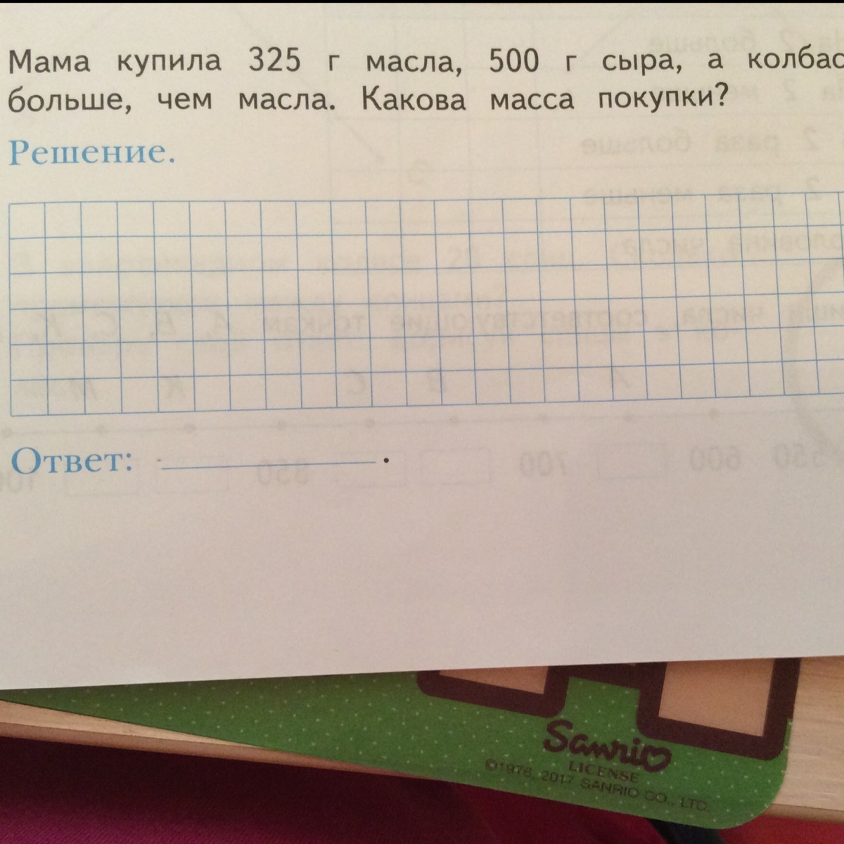 Мама купила 325 г масла, 500 г сыра , а колбасы на 75 г больше , чем масла. Какова масса покупки.