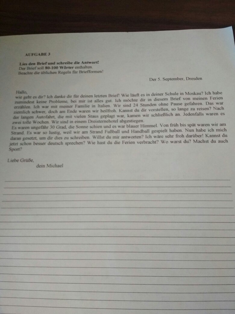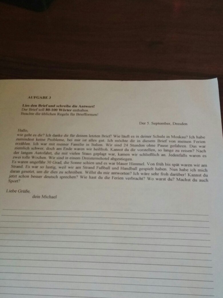 2) Wie läuft es in deiner Schule in Moskau?( Как дела в твоей школе в Москве?) - Ich habe auch keine Probleme in der Schule . Unsere Klasse ist sehr freundlich und alle Lehrer sind sehr nett . ( Я также не имею проблем в школе. Наш класс очень дружный и все учителя очень милые .)