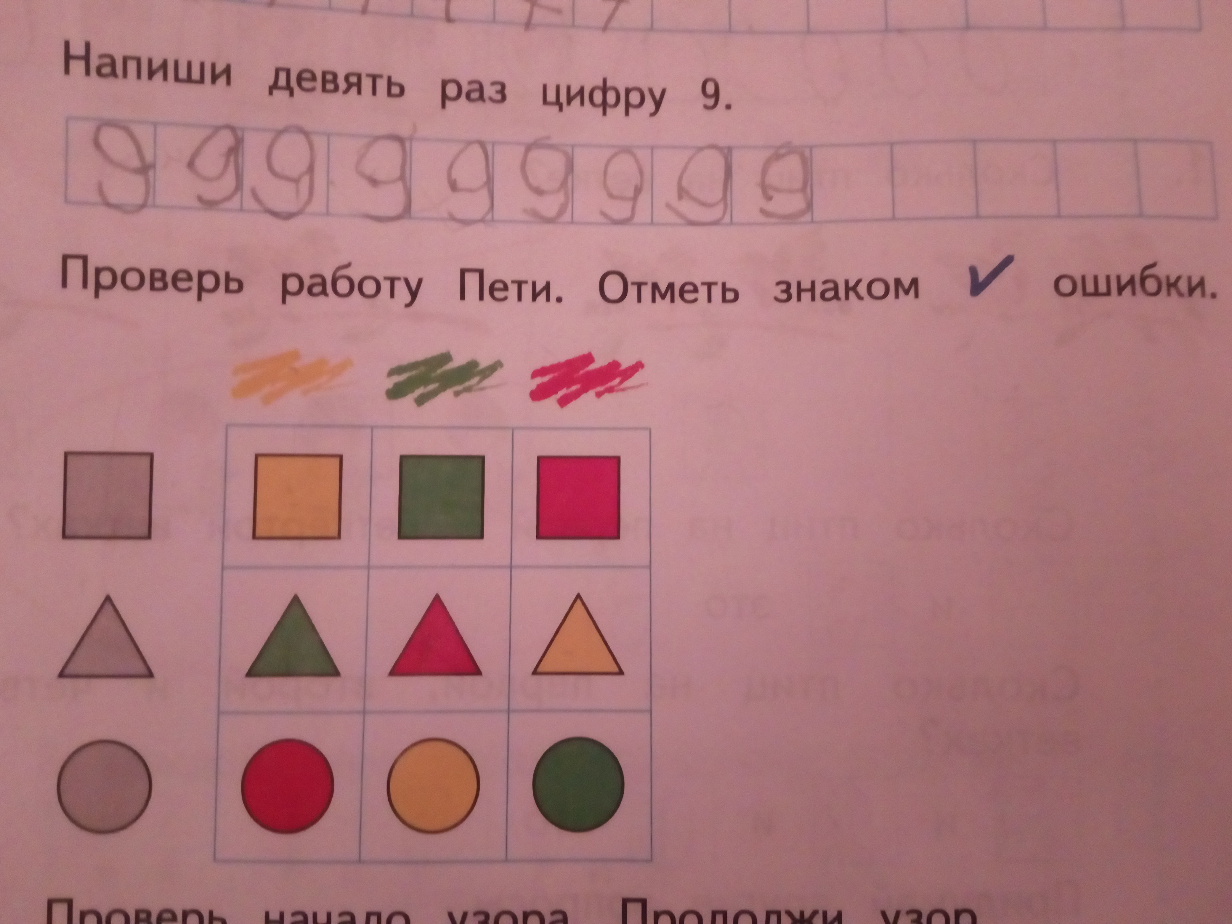 там ошибка "Пети в том что он не правильно разукрасил фигуры. под каждым написанным цветом должен быть именно в тот покашенный цвет фигура. например нарисовано что круг, треугольник и квадрат должны быть желтым а "Пети" разукрасил треугольник в зеленый цвет, а должен был в желтый его покасить