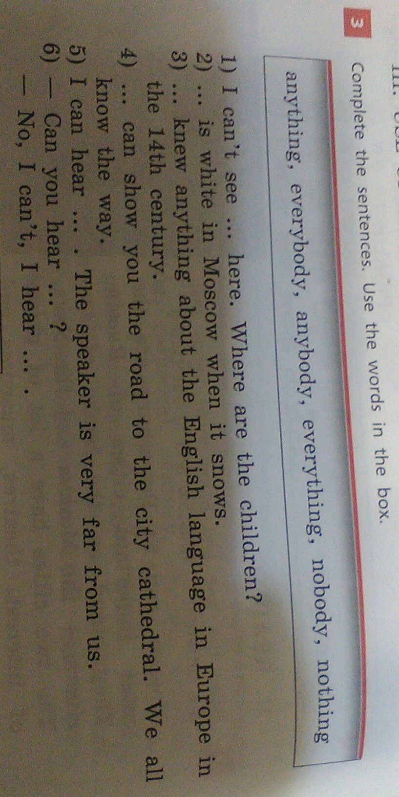 1) anybody 2)everything 3) nobody 4)everybody 5)nothing