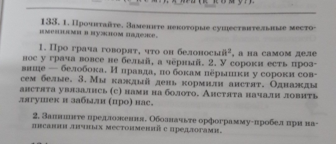 Про грача говорят, что он белоносый, а на самом дела но у него вовсе не белый, а черный.2. У сороки есть прозвище - белобока. И правда, по бокам пёрышки у неё совсем белые.3. Мы каждый день кормили аистят. Однажды они увязались с нами на болото. Они начали ловить лягушек и забыли про нас.