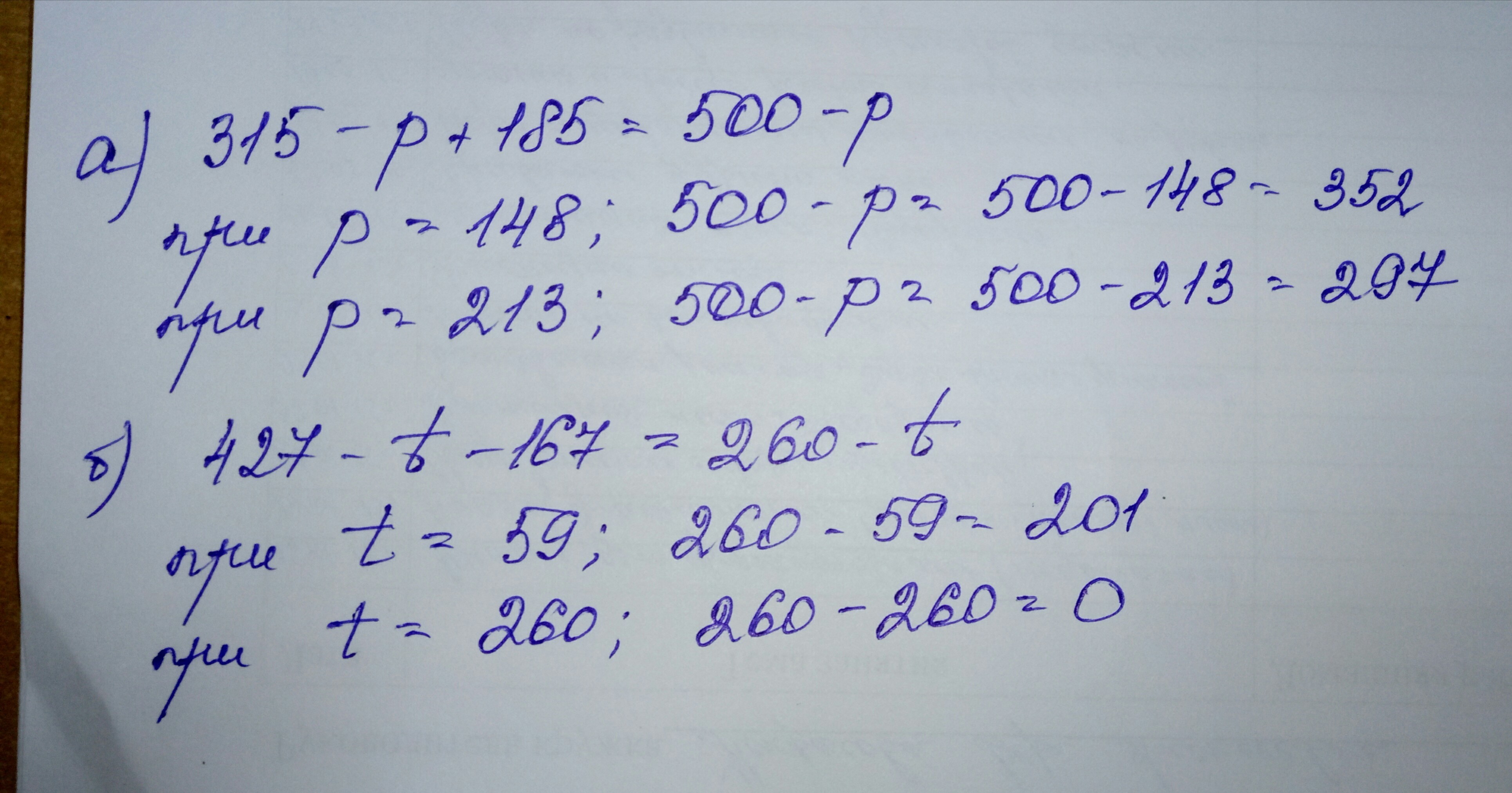Упростите выражение и найдите его значение. А) 315-р+185 при p=148;213; В) 427 -t-167 при t= 59;260.