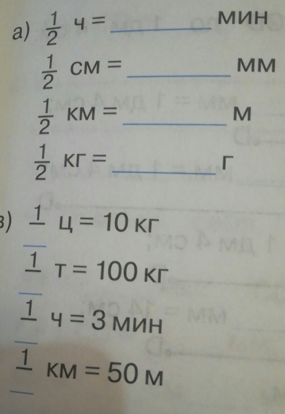 1/2 часа 60 минут 1/2 см 5 мм 1/2 км 500 м 1/2 килограмм 500 г 1 10 центнера 10 кг 1/10 тонны 100 кг 1/20 часа=3минуты. и 1/20 километра 50 м