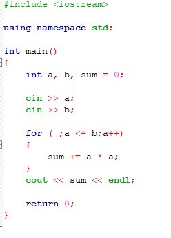 Программа должна вывести одно число – сумму квадратов натуральных чисел из диапазона [ a , b ] .