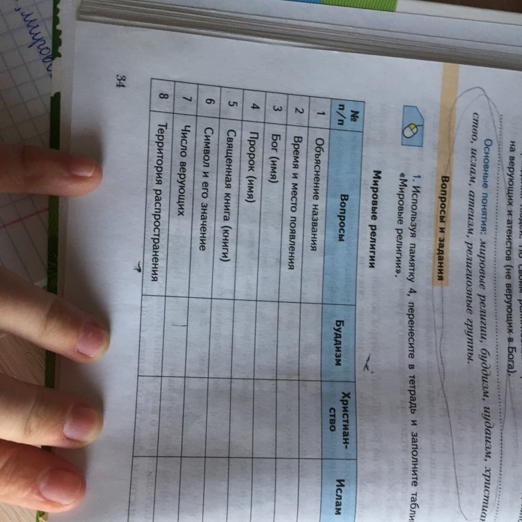 Используя памятку 4 перенесите в тетрадь и заполните таблицу «мировые религии»