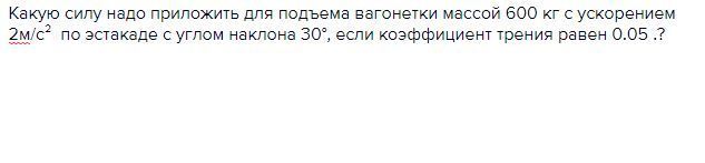 m=600 кг сила: F=ma+Fтр*sin30°=ma+μmg*0,5=m(a+μg*0,5);