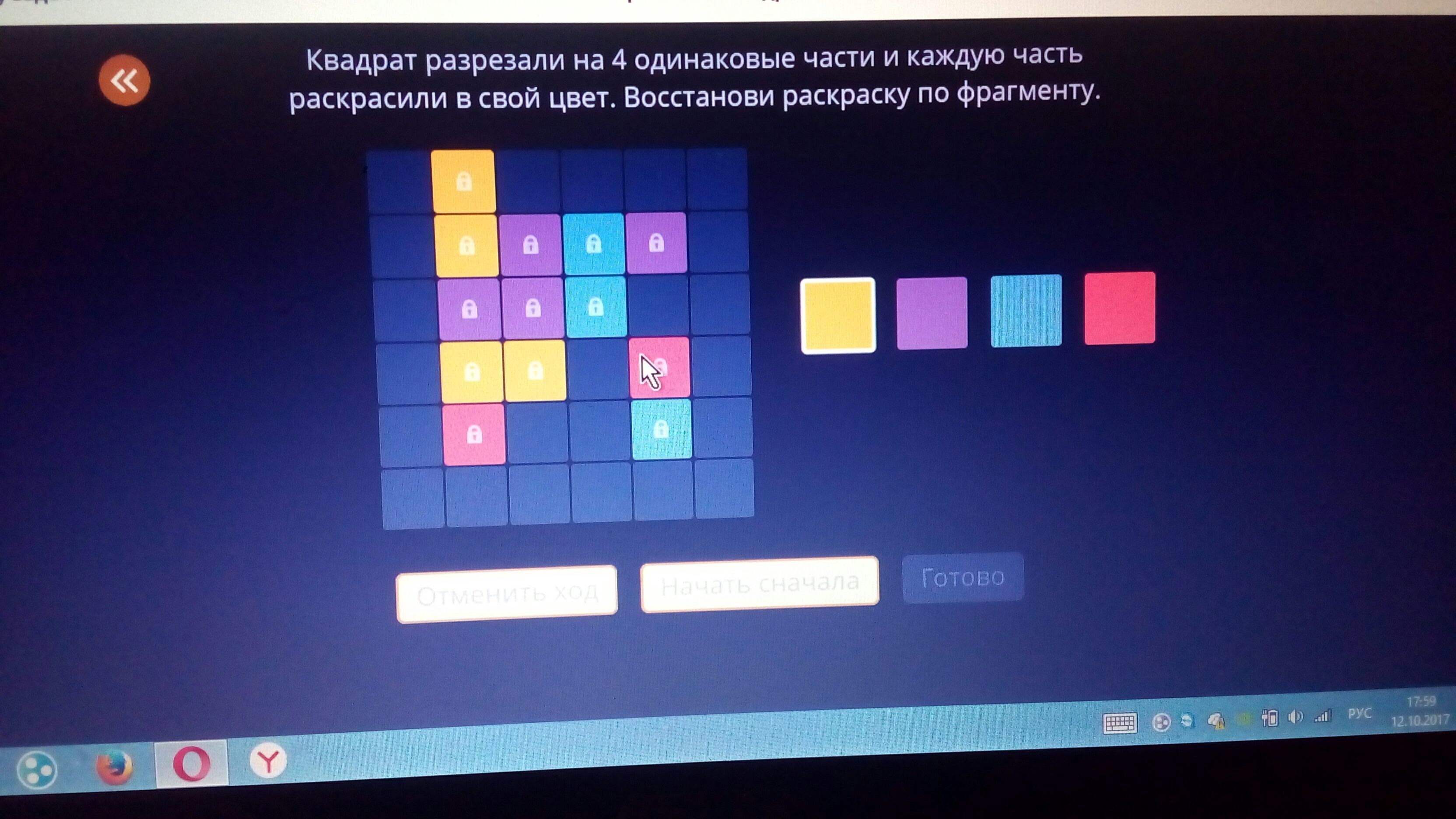Квадрат разрезали на 4 одинаковые части и каждую часть раскрасили в свой цвет. Восстанови раскаску по фрагменту. Ааа срочноо 10мин, заранее спасибооо