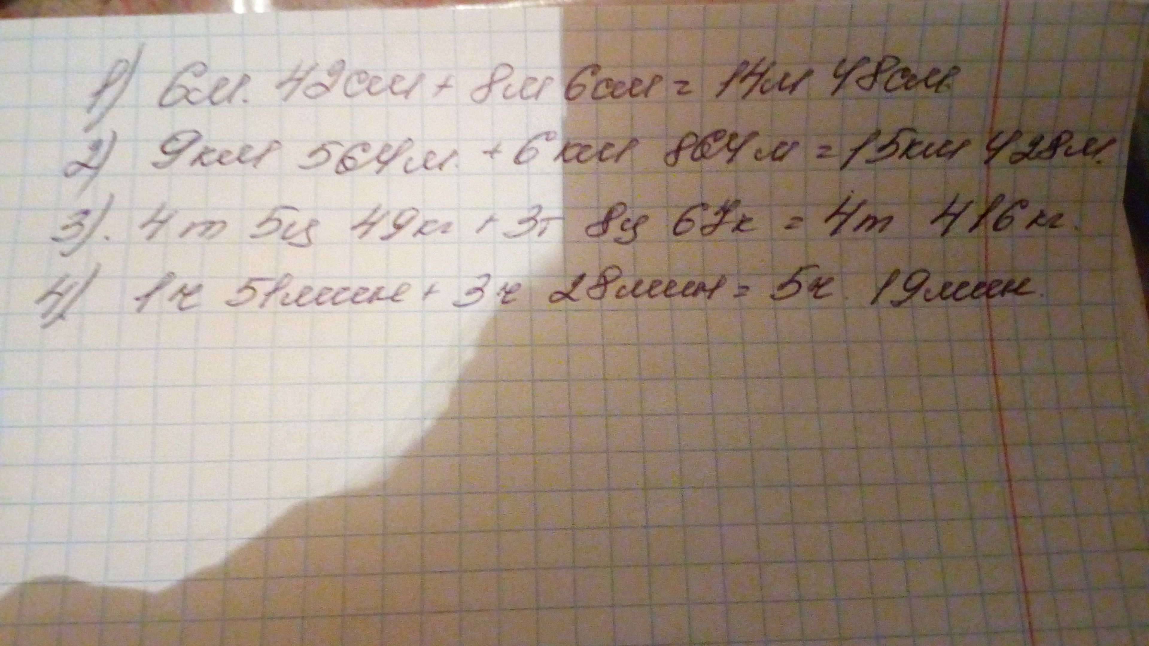 1)14 м 48см. 2) 15км 428м. 3) 4 т 416 кг .4)5ч 19 мин.