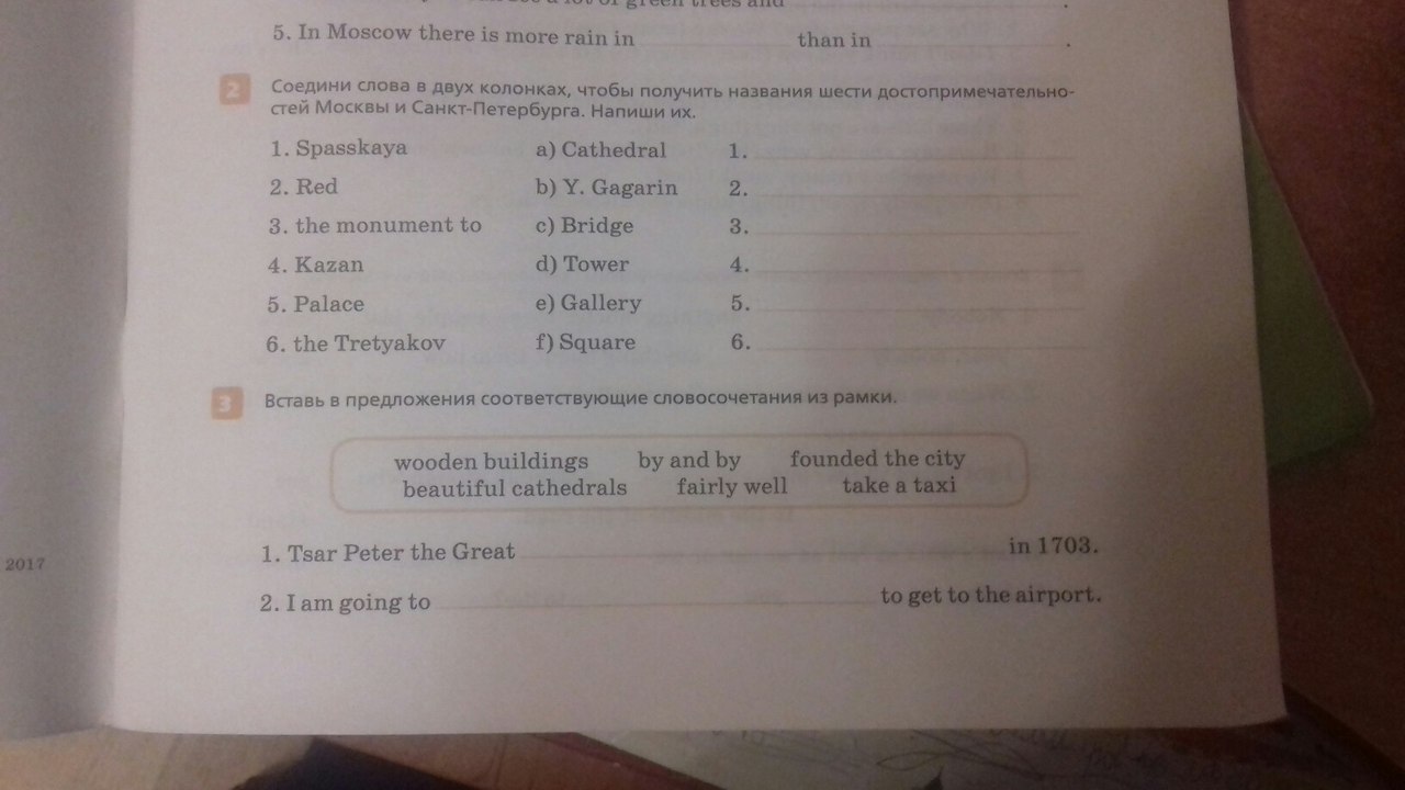 Соедини слова в двух колонках, чтобы получить название шести достопримечательностией Москвы и Санкт- Петербурга. напишете их. 2 задание