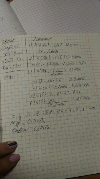 Выведите молекулярную формулу соединения, при сжигании 12 г которой образуется 0,4 моль карбон (IV) оксида и 7,2 г воды. Относительная плотность пара этого соединения по кислороду составляет 1,875.