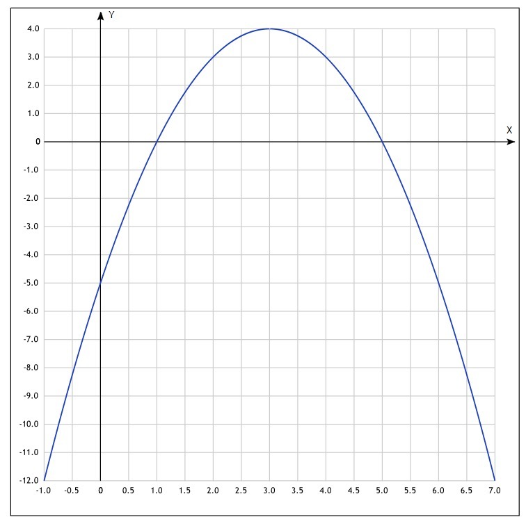 График функции y(x) - парабола, с ветвями вниз, с вершиной в точке 3, имеет 2 корня: 1 и 5.