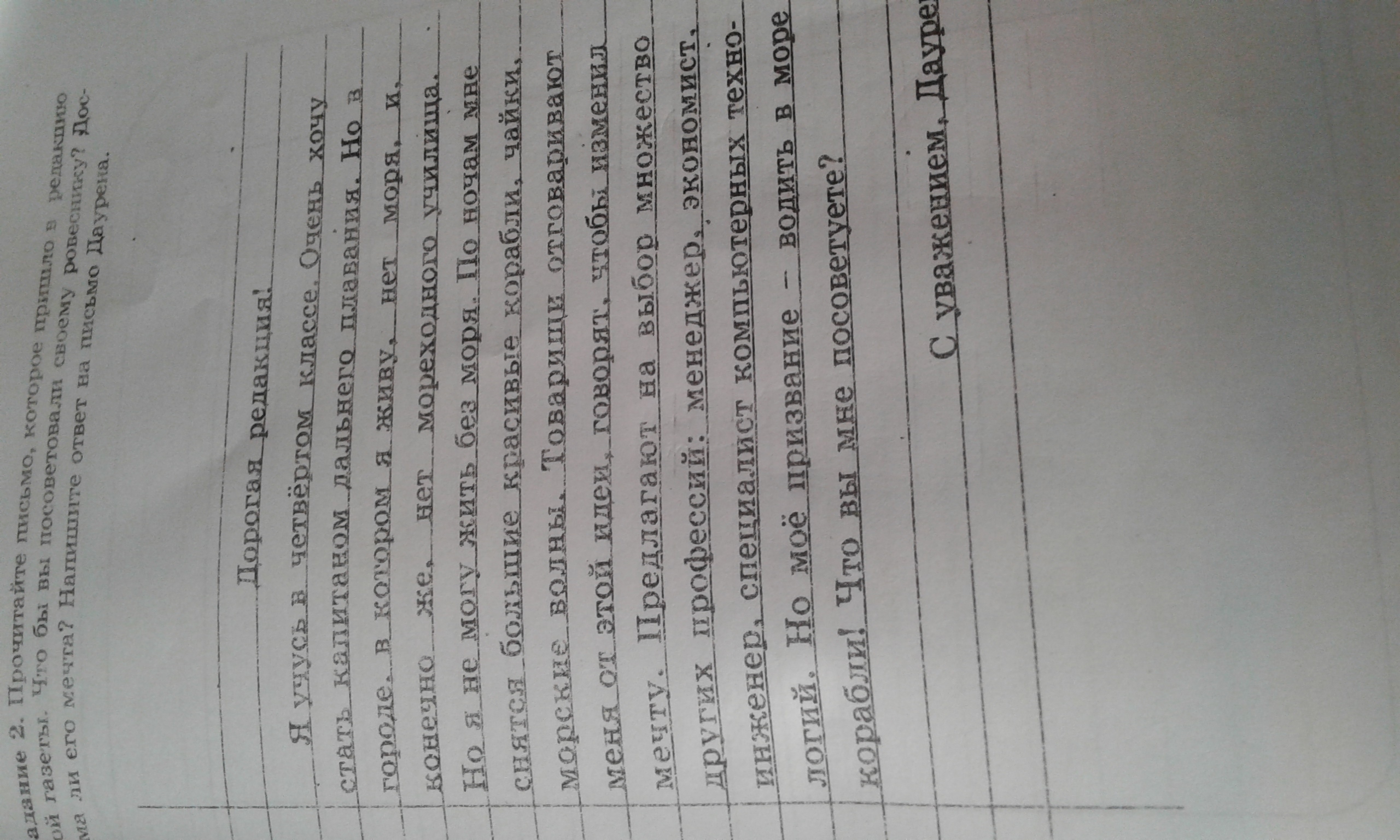 прочитайте письмо которое пришло в редакцию что бы вы посоветовали своему ровеснику достижима его мечта ? напиши ответ на письмо Даурена . помогите пожалуйста