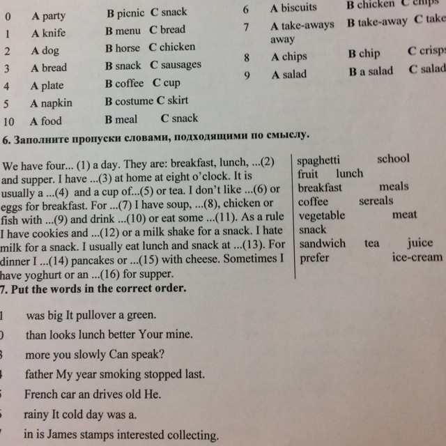 1)meals,2)snack,3) breakfast,4)sandwich,5)coffee,6)sereals,7)lunch,8)meat,9)vegetables,10)tea,11)fruit,12)juice,13)prefer,15)spaghetti,16)ice-cream