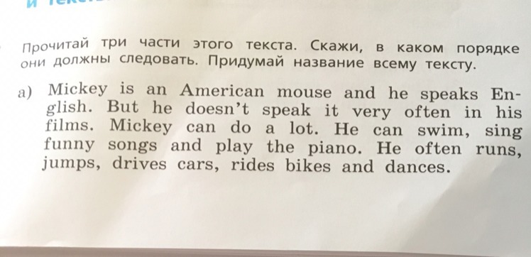 a) Микки - американская мышь, и он говорит по-английски. Но он не очень часто говорит об этом в своих фильмах. Микки может многое сделать. Он может плавать, петь смешные песни и играть на пианино. Он часто бегает, прыгает, водит автомобили, катается на велосипедах и танцах