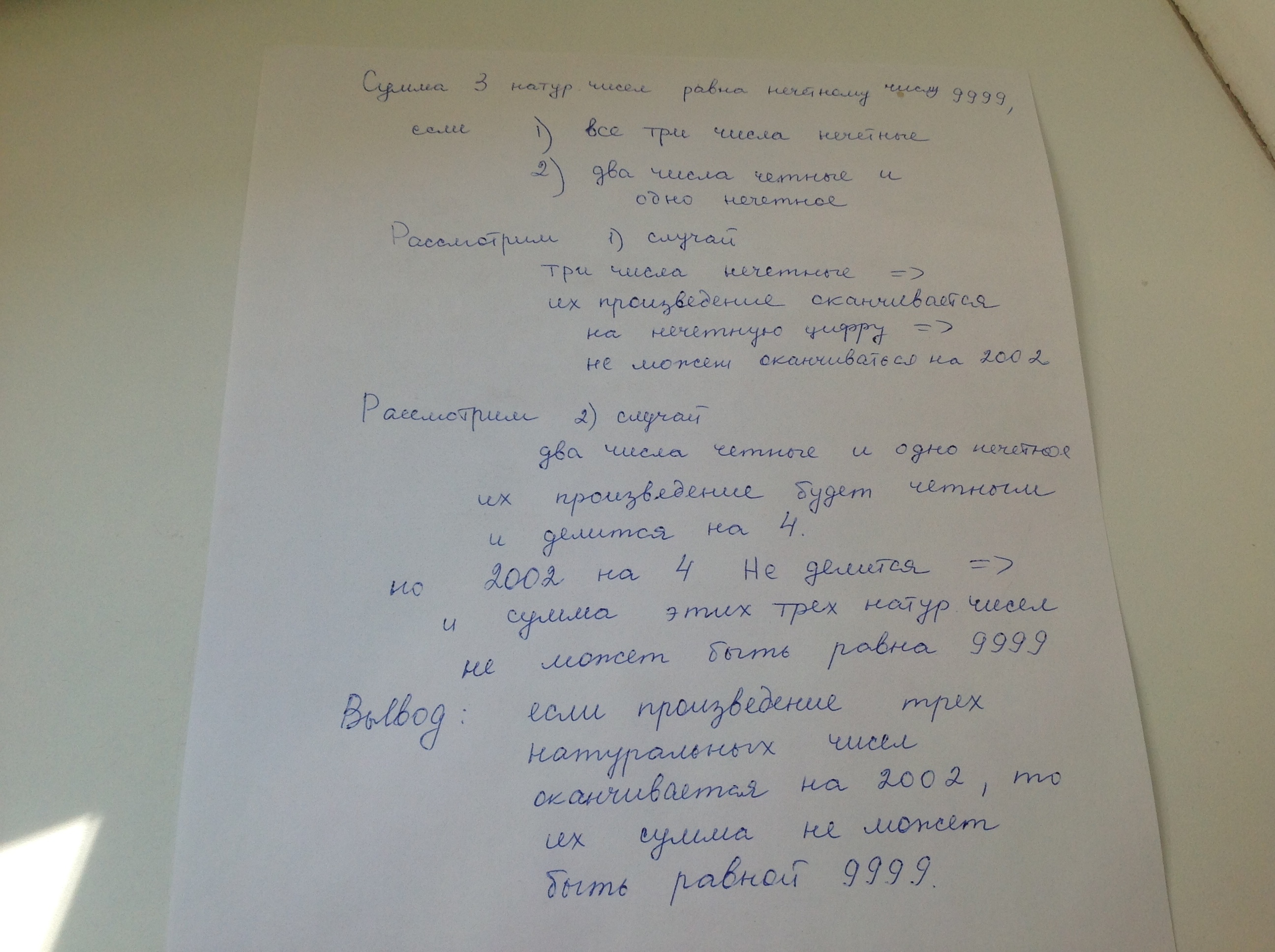 Произведение трех натуральных чисел оканчивается на 2002. Докажите, что их сумма не может равняться 9999