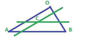 начертите треугольник AOB и отметь точку C внутри его. Через точку C проведите прямые, параллельные сторонам AO и BO.