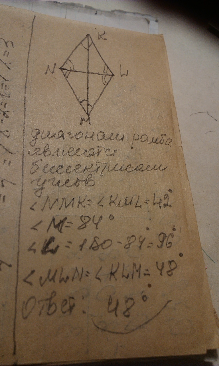 В ромбе MNKL угол между стороной MN и диогональю MK равен 42°. Чему равен угол между стороной KL и диагональю NL?