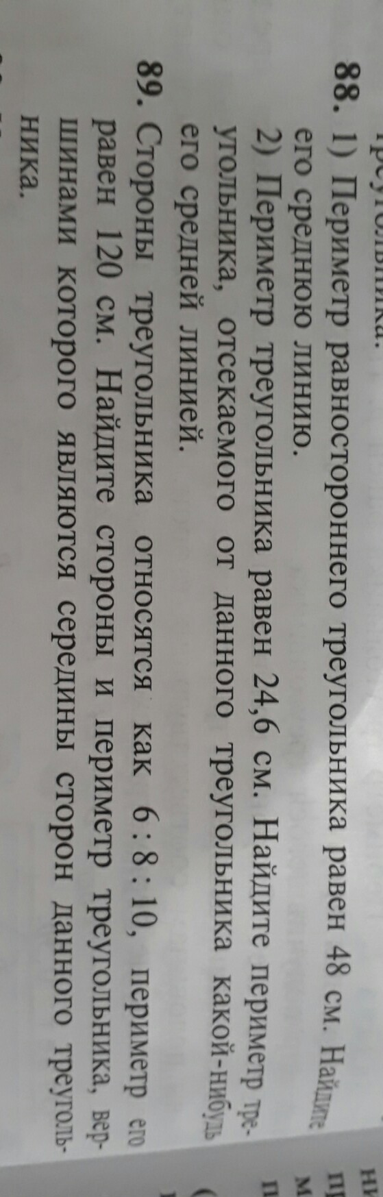 ПЕРИМЕТР ТРЕУГОЛЬНИКА РАВЕН 24,7 СМ.НАЙДИТЕ ПЕРИМЕТР ТРЕУГОЛЬНИКА,ОТСЕКАЕМОГО ОТ ДАННОГО ТРЕУГОЛЬНИКА КАКОЙ-НИБУДЬ ЕГО СРЕДНЕЙ ЛИНИЕЙ.И N89 тож помогите плз