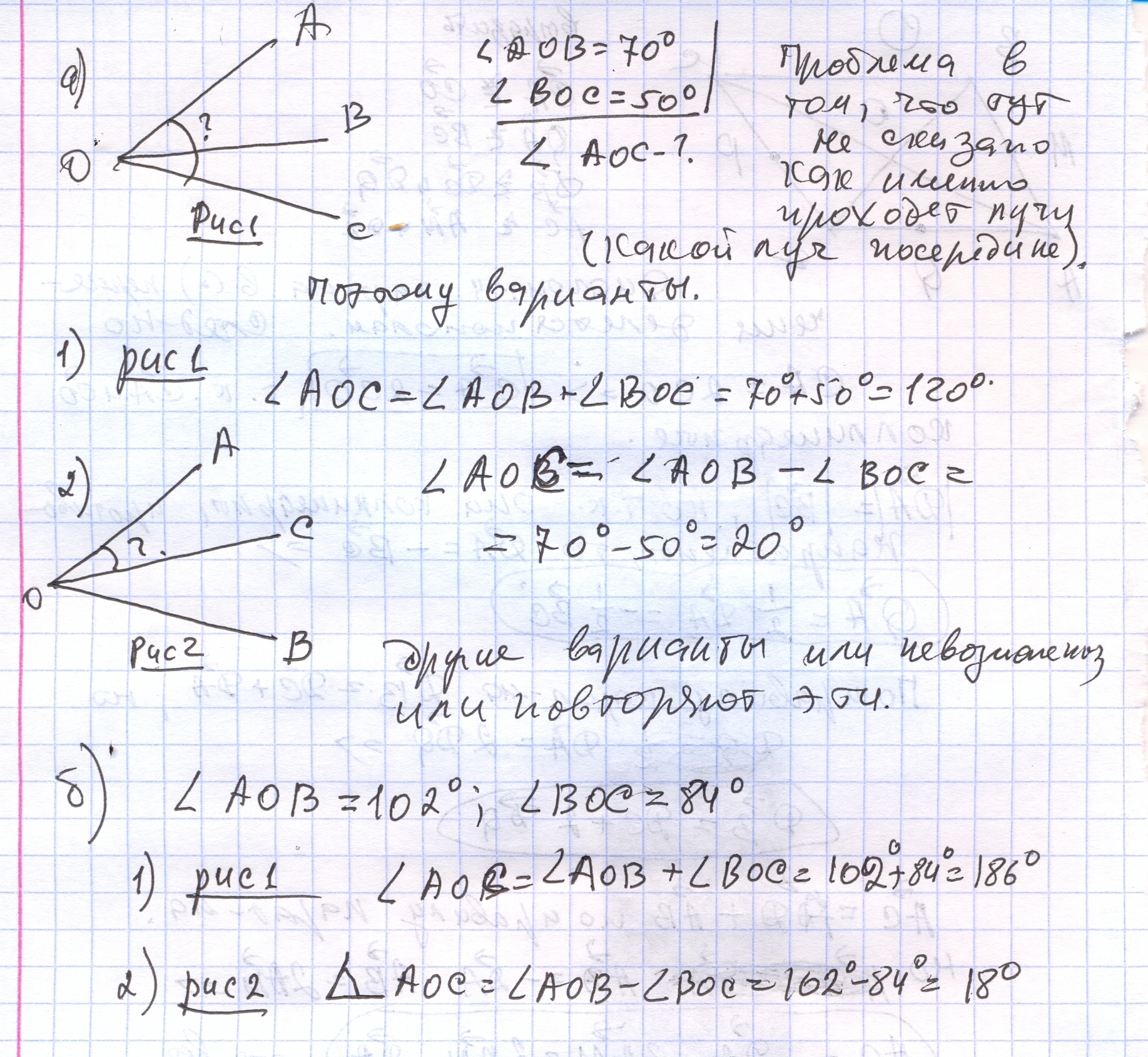 на плоскости проведены три луча оа об ос,чему равен луч АОС если: а)<АОВ=70 градусов,<ВОС=50градусов б)<АОВ=102 градуса,<ВОС=84 градуса?