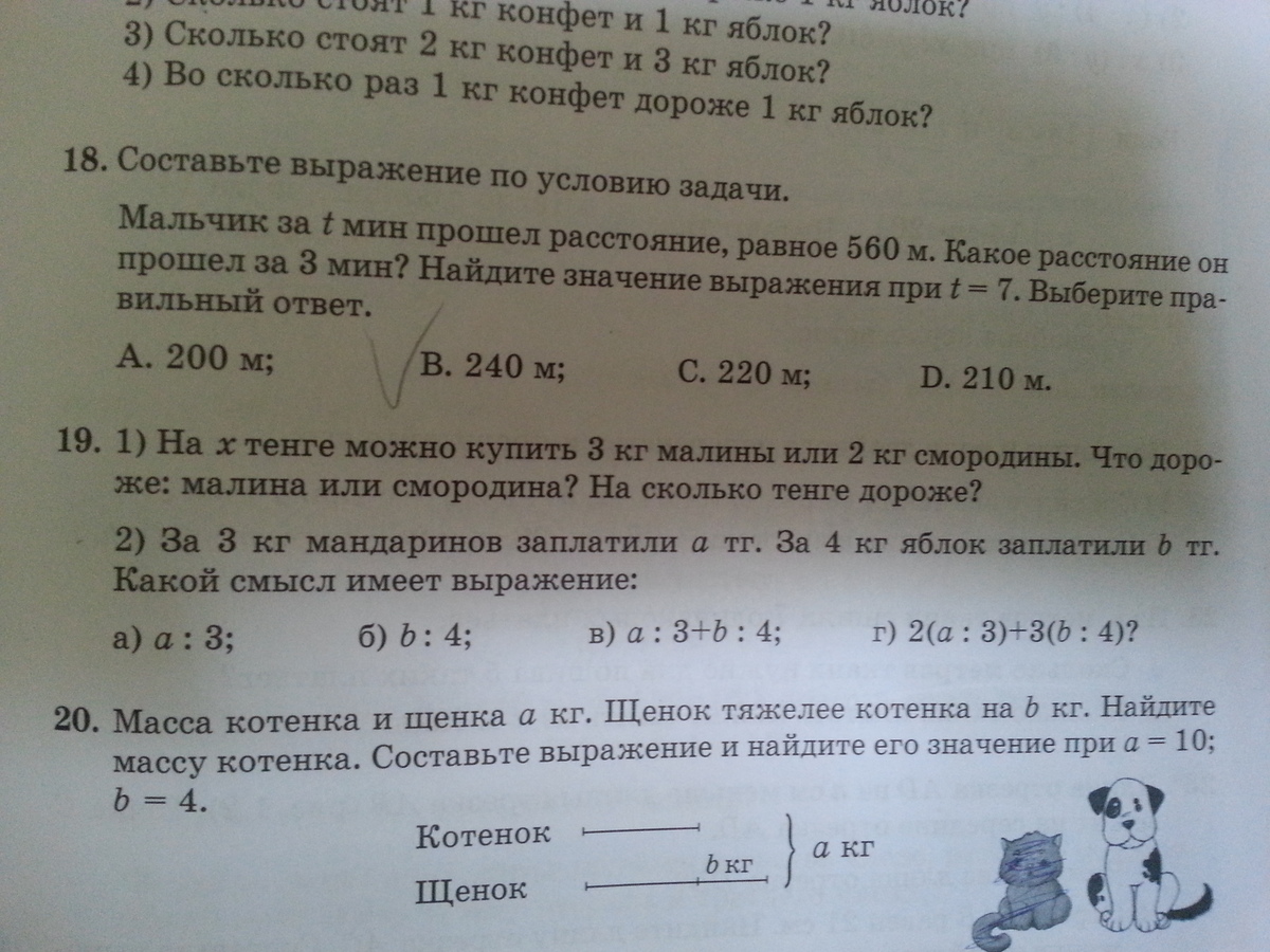 2(а:3) + 3(в:4) - стоит всего 2г мандаринов и 3кг яблок.
