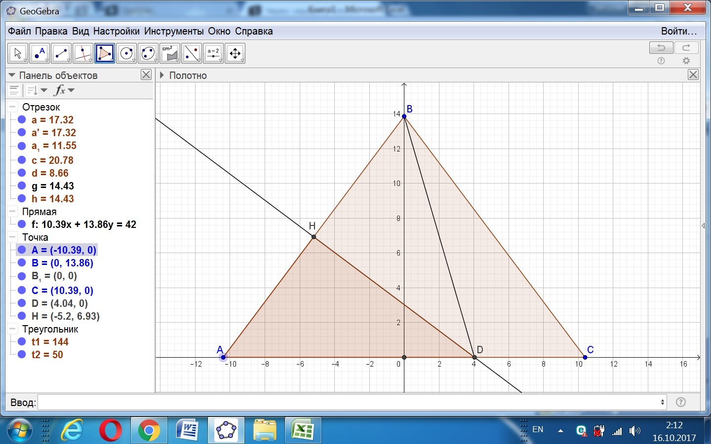 Имеем равнобедренный треугольник АВС, АВ = ВС. Точка Н - середина АВ. Перпендикуляр к АВ в точке Н - отрезок ДН. Площадь АВС = 144, площадь АНД = 50, угол ВАС = углу ВСА. Основание высоты из вершины В - точка Е.