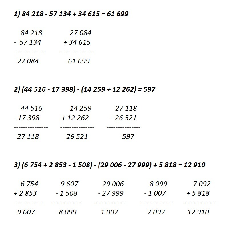 вычислите 84218-57134+34615-? (44516-17398)-(14259+12262)-? (6754+2853-1508)-(29006-27999)+5818-?
