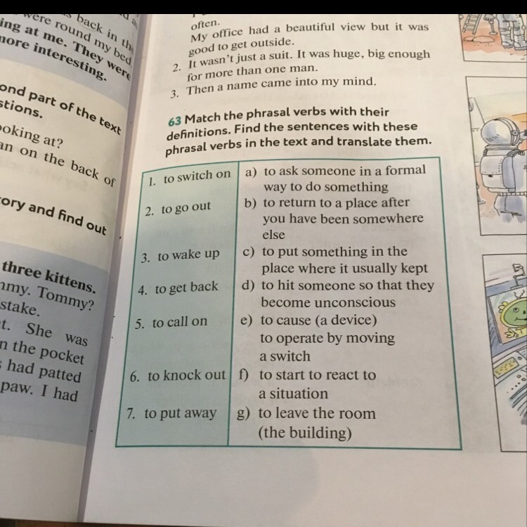 I. включить a) попросить кого-то формально сделать что-то 2, чтобы выйти b) вернуться в место после того, как вы были где-то в другом месте 3, просыпаться c) положить что-то в том месте, где обычно держал 4., чтобы вернуться назад d) ударить кого-то, чтобы они потеряли сознание 5, чтобы вызвать e) заставить (устройство) работать, перемещая переключатель 6., чтобы выбить f), чтобы начать реагировать на ситуацию 7 до убрать g) выйти из комнаты (здания)