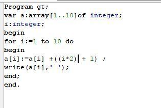 составить программу заполнения массива а[1..10] следующими числами: индекс массива 1 2 3 4 5 6 7 8 9 10 значение элемента 3 5 7 9 11 13 15 17 19 21 закономерность-Для каждого элемента массива его значение равна удвоенному индексу Увеличенному на 1