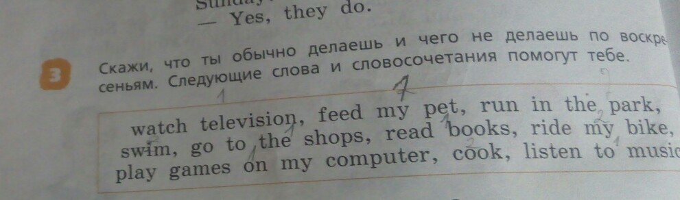 Тут всё просто, могу сделать перевод, ты ответишь, нужно выбрать своё: смотреть телевизор, кормить животное, бегать в парке, плавать, идти в магазины, читать книги, ездить на велосипеде... если ты хочешь написать то что ты не делаешь пиши: I don't (И то что ты не делаешь)