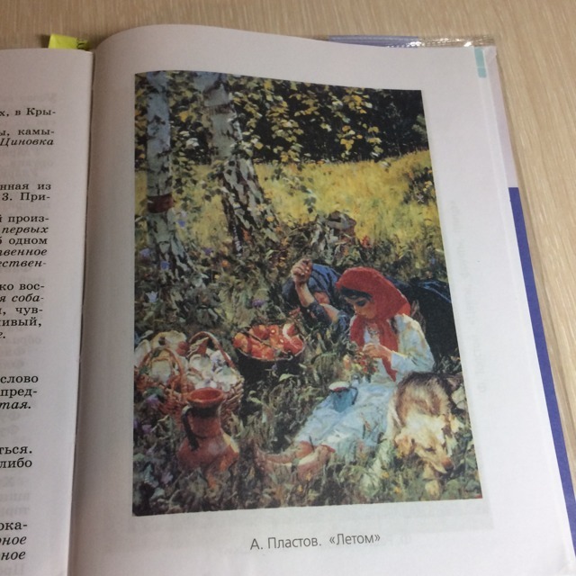В первую очередь нам передаётся радостное спокойствие летнего дня, когда с самого раннего утра женщина и её внучка выбрались за грибами. Они отдыхают в тени белоствольных берёзок. Их усталость, когда хочется присесть и прилечь , чтобы отдохнуть, переходит к нам. Они обе утомились, собирая грибы. Женщина и девочка отдыхают на поляне. Возле них стоят корзина и ведро, полные грибов. Женщина совсем устала и лежит, не поднимаясь, возможно, она крепко заснула. Девочка сидит рядом, внимательно берёт ягоды с ветки и крадёт их в кружку. Они собирали ещё и ягоды в кувшин, чтобы они не помялись. Девочка босиком, женщина, возможно, тоже. На женщине всё синего цвета, на девчушке светловатый сарафан и красный платок. Рядом дремлет их собака, которая побежала с ними в лес. Голова собаки лежит на лапах, но она не спит, а всё внимательно слушает. Кругом всё залито солнечным светом. За берёзками растёт трава, уже подсохшая. Они собирали грибы, вероятно, в августе. За полянкой высокой стеной стоят деревья. На полянке мы замечаем небольшой пень. Эта картина о нашем лете, которое так богато на дары природы, когда можно набрать ягод и грибов. Потом зимой насладятся крестьяне всем, что собрали щедрым летом в нашем лесу. Увидев эту картину, так и хочется пройтись по русскому лесу, вдохнуть запах собранных грибов и ягод, отдохнуть в тени двух берёзок.