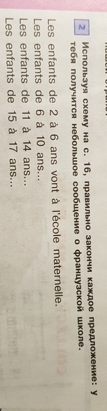Используя схему на с. 16, правильно закончи каждое предложение: у тебя получится небольшое сообщение о французской школе.