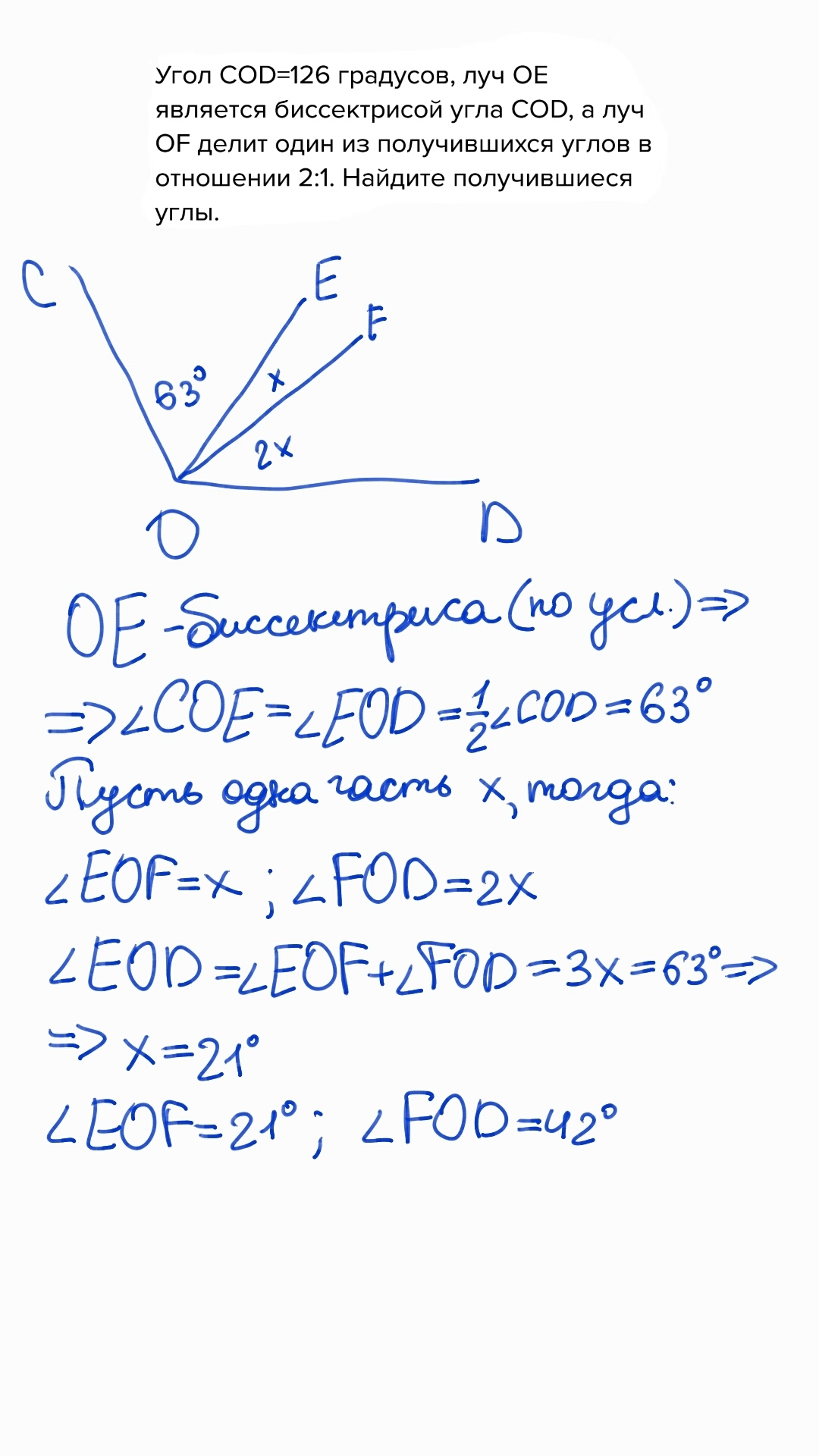 Угол COD=126 градусов, луч OE является биссектрисой угла COD, а луч OF делит один из получившихся углов в отношении 2:1. Найдите получившиеся углы.