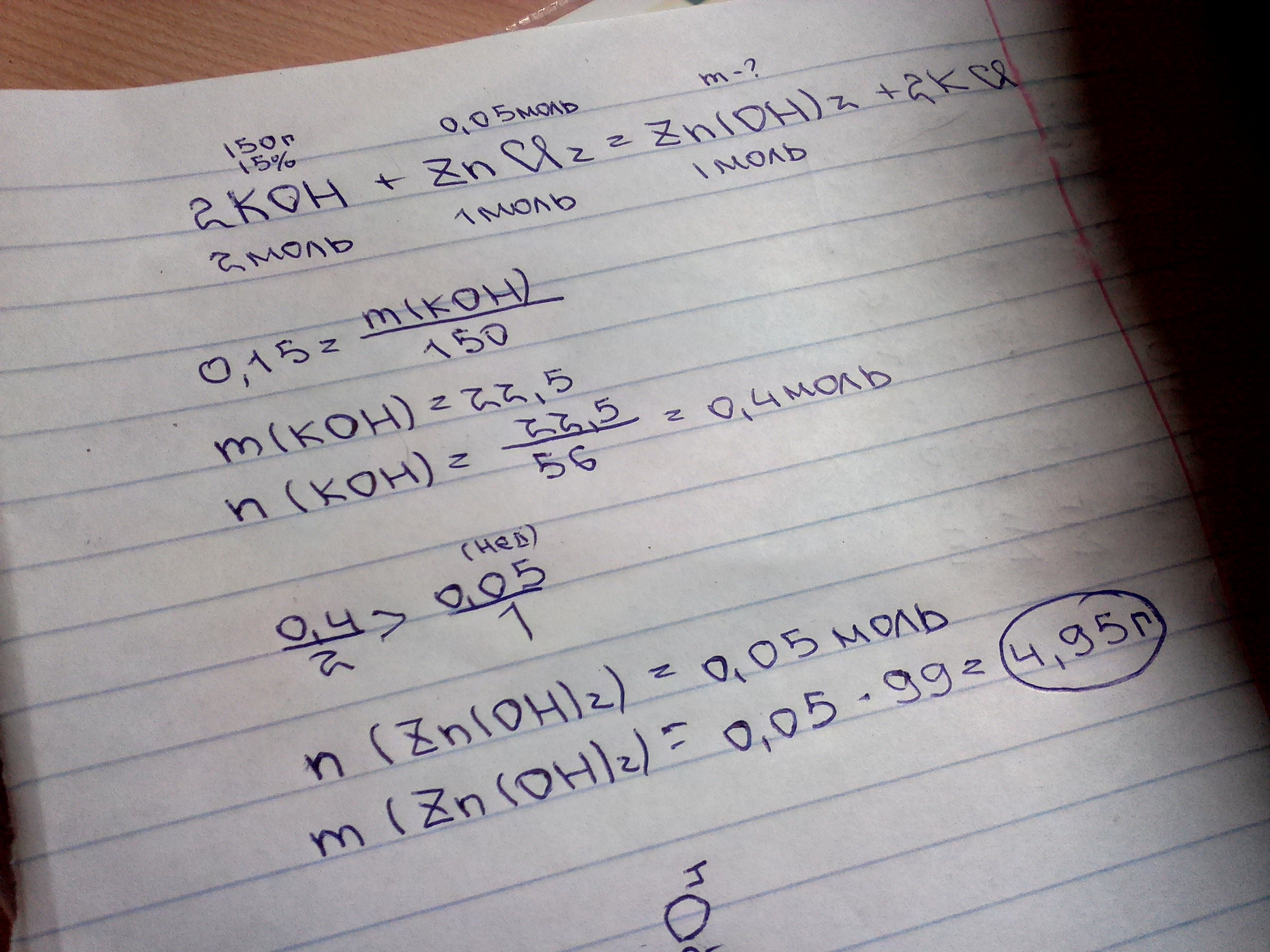 к 150 г раствора гидроксида калия с массовой долей 15% добавили 0,05моль хлорида цинка, определите массу осадка