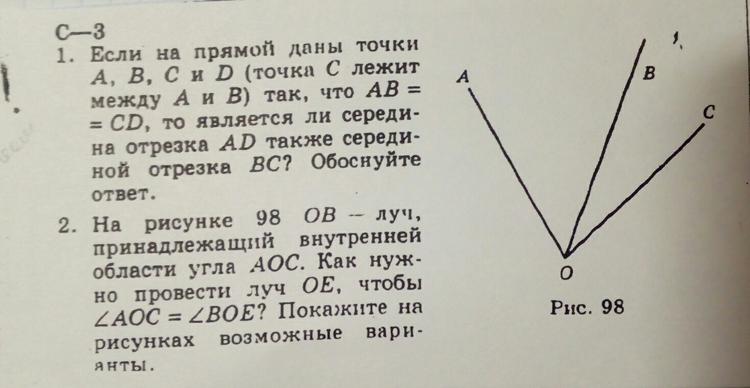 измерь расстояние от А до С. прямую проведи так чтоб угол АОВ остался внутри твоего угла( на таком же расстоянии)