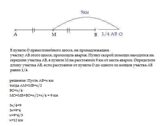 В пункте О прямолинейного шоссе, не принадлежащем участку АВ этого шоссе, произошла авария. Пункт скорой помощи находится на середине участка АВ, в пункте М на расстоянии 9 км от места аварии. Определите длину участка АВ, если расстояние от пункта О до одного из концов участка АВ равно 1/4