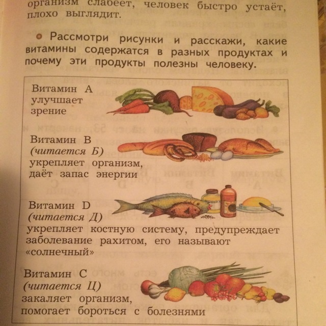 Для Человека важно употребление пищи для жизни!Но не все продукты бывают полезны для организма человека!Поэтому учёные изучили состав пищи и нашли что у множество еды есть витамины.Их разбили на 4 группы.И у этих групп есть свои способности!Например:Витамин A который улучшает зрение человека и содержится в таких продуктах как морковь свёкла сыр,витамин B который даёт большой запас энергии и укрепляет твой организм хлеб мясо варёные яйца,витамин D который улучшает костную систему и укрепляет кости рыба подсолнечное масло,витамин C он помогает бороться с болезнями капуста лимон помидоры.И все эти витамины помогают нашему организму в жизнедеятельности!