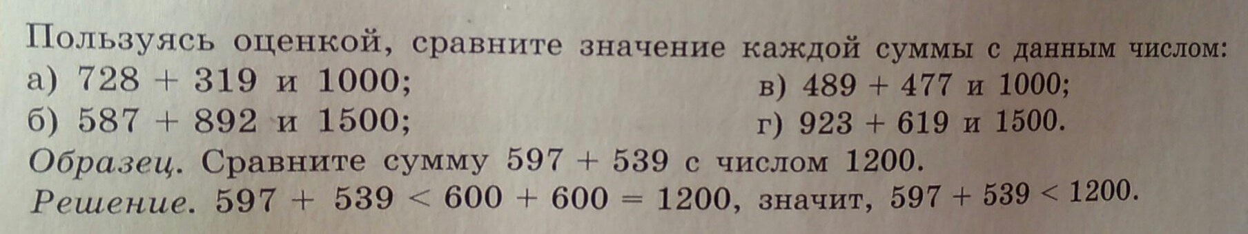 в) 489 + 477 < 1000 = 500 + 500