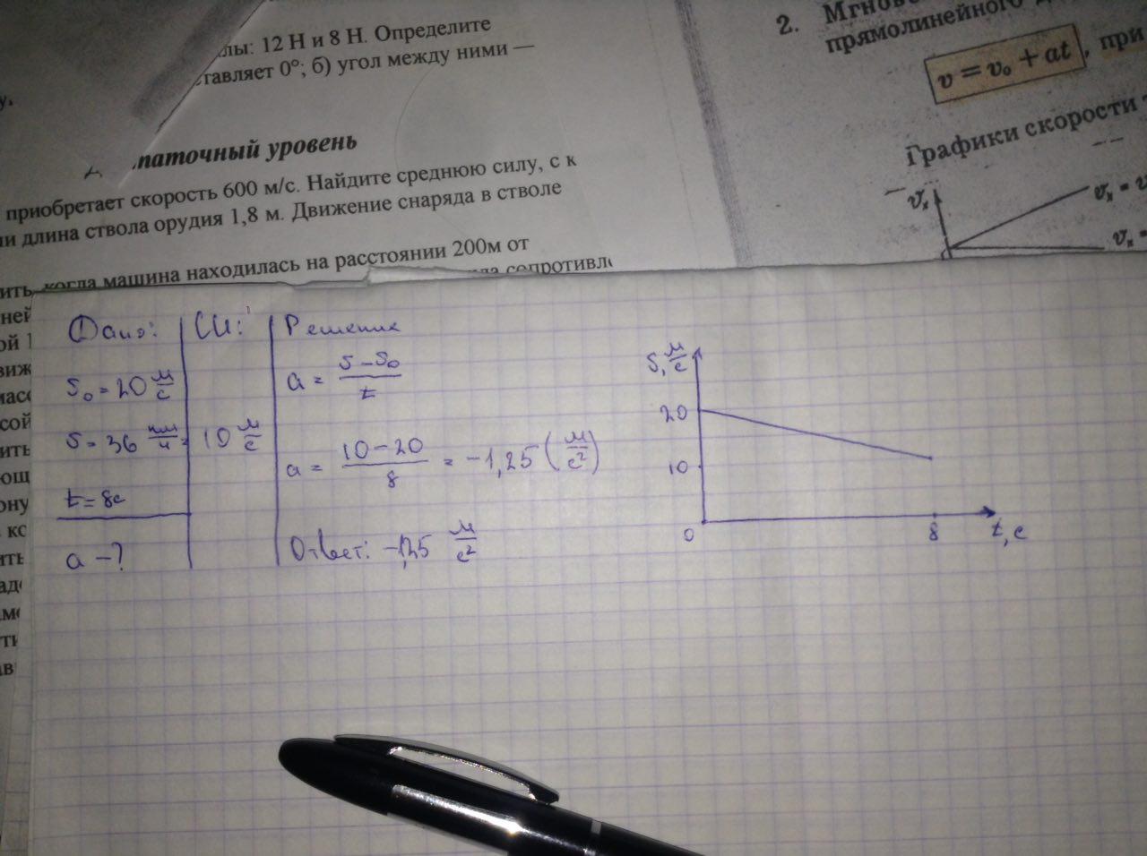 Чему равно ускорение тела , если скорость его движения от 20м/с уменьшилось до 36км/ч за 8с? Построить график скорости. Помогите пожалуйста решить эту задачу(((